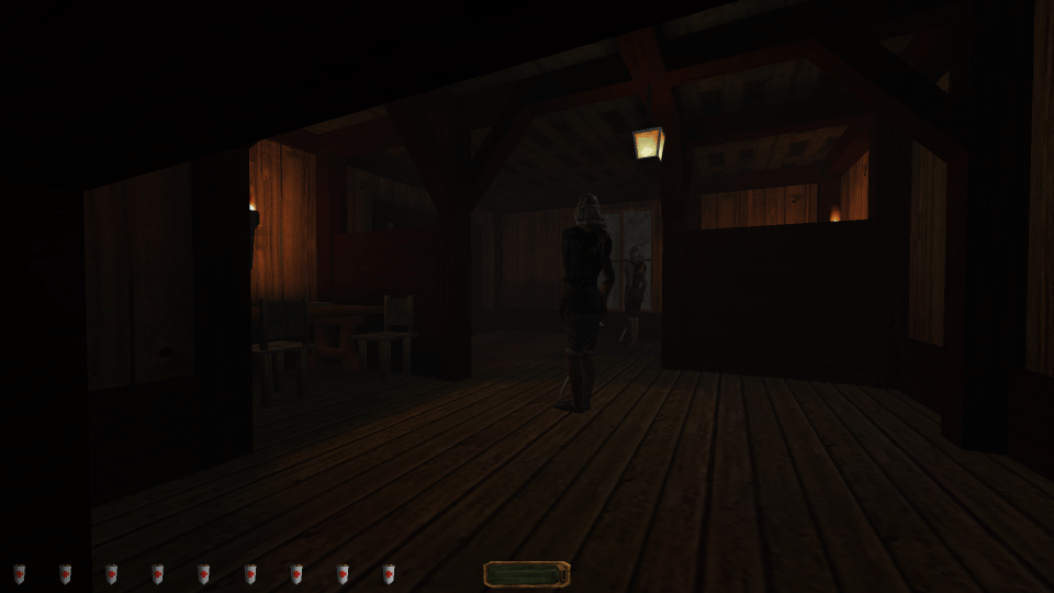 In Gathering at the Inn you play as Dante, one of the thief characters from the greater “Circle of Stone and Shadow” fiction. He is on a trial run for Lord Nightfall, the warden he’s recently signed with, and the objective is to steal a bunch of scepters from members of a scepter owner’s club who are each staying at the “Grieving Burrick” inn. The main goal is a fire mage’s scepter but to disguise the theft of this one item all the scepters, six in total, are to be stolen. Dante must also pick up some loot and, on the highest difficulty, avoid harming anyone but the guards. (Using a blackjack is harmful.)