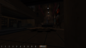 One of the best scenes is in the kitchen and rec room area. A dead body lies face down on stove eyes, a sickening broiling sound coming from beneath it. A dance area, with flashing lights and Climb from Quake II (or The Grinding of the Gears by “Friend Quake”) playing, is littered with corpses and blood stains. Dead bodies can also be found in the freezer, where a ghost scene of the last moments between the two deceased AI plays. Whatever force wrought havoc here, it showed no mercy.